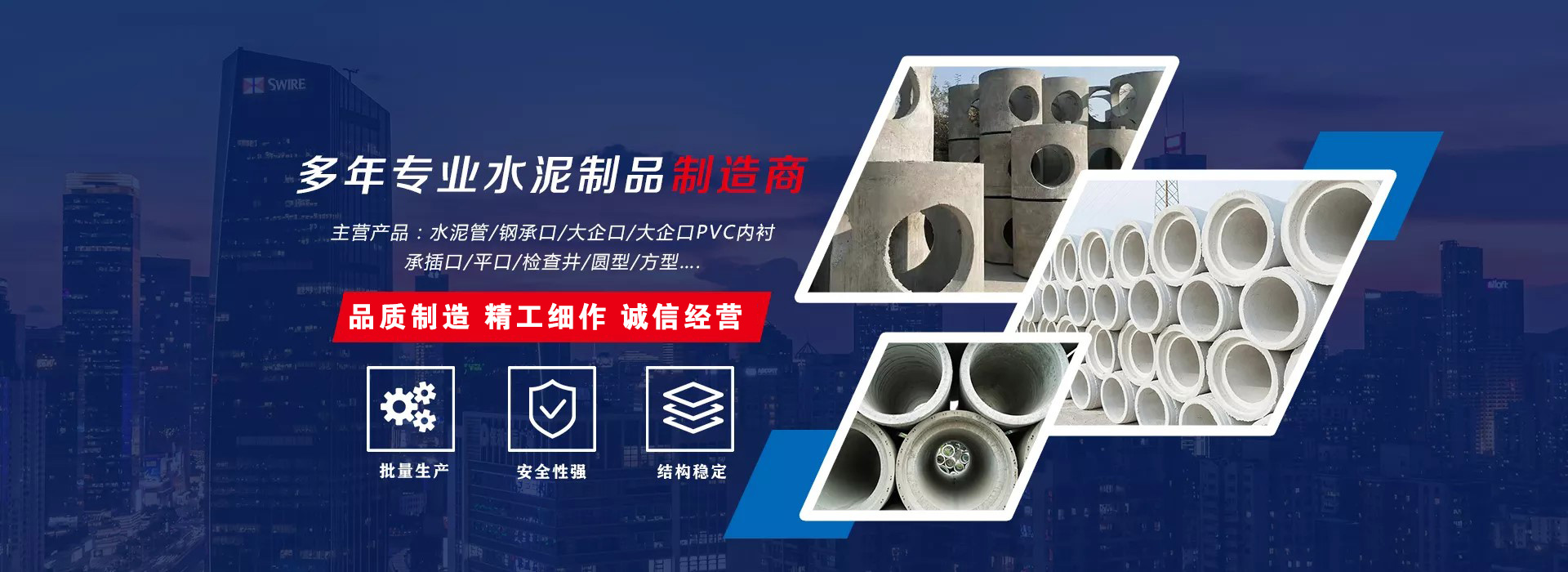 20余年始终如一,集研发、设计、生产、定制、加工、销售水泥排水管、水泥检查井、水泥电缆沟盖板、水泥预制件等产品为一体。公司拥有1000余人的生产加工团队,具备20余人的专业销售团队,并通过代理、分销、批发等多种销售渠道,为客户提供优质的水泥制品解决方案。